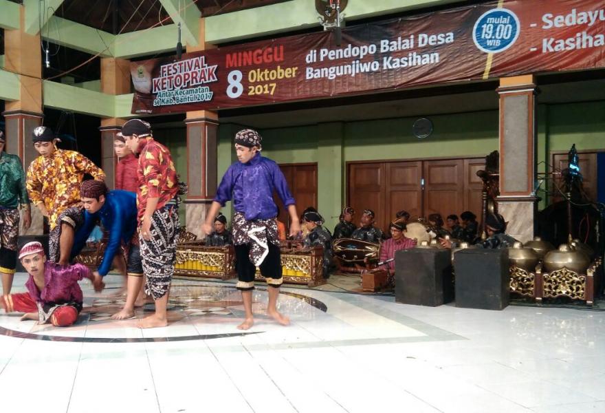 Minggu (08/10/2017) Pendopo Desa Bangunjiwo malam ini menjadi ajang Festival Kethoprak Kabupaten Bantul tahun 2017. Kegiatan yang diselenggarakan oleh Dinas Kebudayaan Kabupaten Bantul ini merupakan jadwal yang terakhir dimana pada malam ini menampilkan 2 kontingen yaitu dari Kecamatan Sedayu dan Kasihan. Dalam setiap tahunnya Pendopo Desa Bangunjiwo selalu menjadi tempat penyelenggaraan kegiatan ini dan masyarakat sangat antusias menyaksikan festival ini. Pendukung dari masing2 kontingen selalu memenuhi tempat penonton yang disediakan panitia untuk memberikan suport kepada para pemain kethoprak yang berlaga. Pada jadwal terakhir ini sekaligus diumumkan pemenang festival kethoprak tahun 2017 dimana kontingen Kecamatan Kasihan berhasil menjadi juara I sebagai penyaji terbaik.