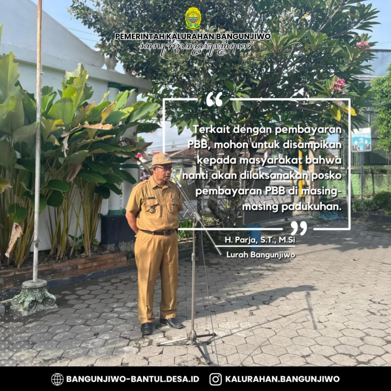 Pemerintah Kalurahan Bangunjiwo melaksanakan kegiatan apel pagi pada Senin (5/05/2025). Apel pagi ini diikuti oleh Lurah beserta jajaran pamong dan Bamuskal Kalurahan Bangunjiwo. Dalam apel pagi hari ini, Lurah Bangunjiwo, Bapak H. Parja, S.T., M.Si. menyampaikan bahwa terkait dengan pembayaran PBB, mohon disampaikan kepada masyarakat bahwa akan dilaksanakan posko PBB di masing-masing Padukuhan sesuai dengan jadwal yang telah dibuat. Selanjutnya, terkait dengan Pekan Olahraga Desa Bangunjiwo yang akan segera dilaksanakan, dimohon untuk semuanya bisa membantu proses persiapan sehingga PODB ditahun ini dapat berjalan dengan baik dan lancar. Dalam apel hari ini, juga dilaksanakan perkenalan oleh Babinsa Kalurahan Bangunjiwo yang baru yakni Bapak Serma. Agus Pamungkas