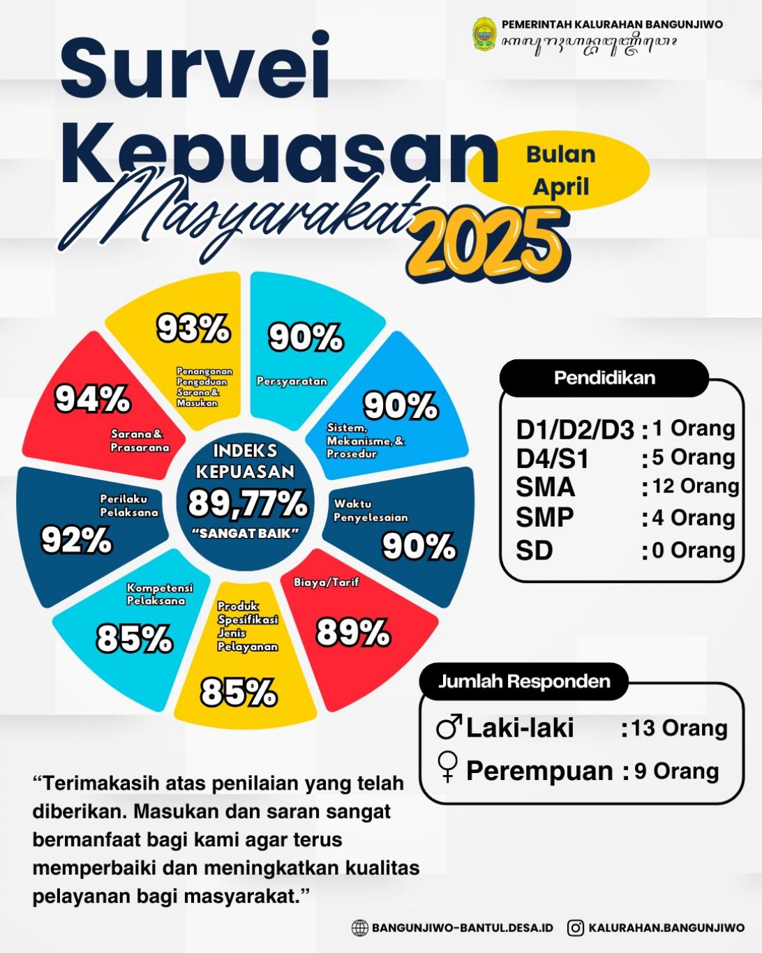 Berikut kami sampaikan hasil survei kepuasan masyarakat terhadap pelayanan Pemerintah Kalurahan Bangunjiwo. Terimakasih atas penilaian yang telah diberikan. Masukan dan saran sangat bermanfaat bagi kami agar terus memperbaiki dan meningkatkan kualitas pelayanan bagi masyarakat.