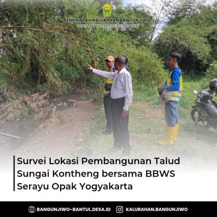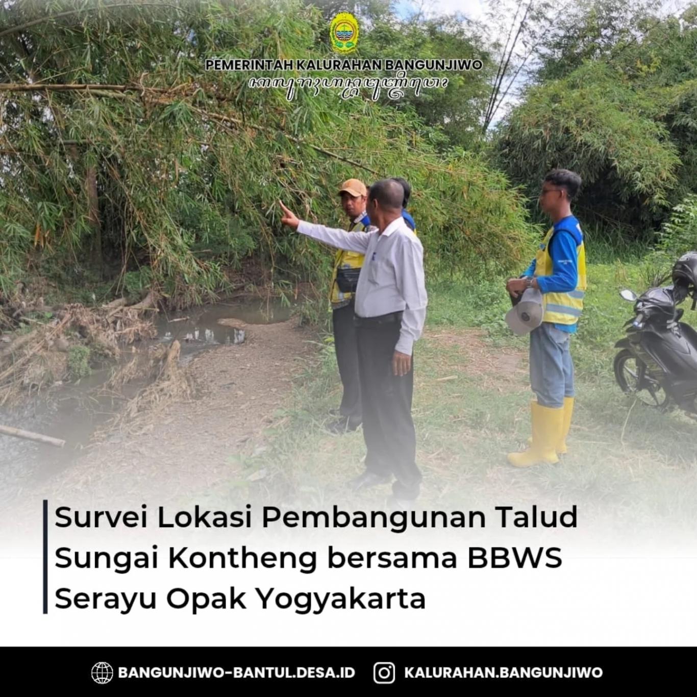 Selasa 7/05 Pemerintah Kalurahan Bangunjiwo mendampingi Balai Besar Wilayah Sungai Serayu Opak melaksanakan survei lokasi rencana pembangunan talud sungai Konteng Donotirto Bangunjiwo. Survei ini dilaksanakan sebagai tindak lanjut atas pengajuan proposal dari masyarakat untuk membangun talud sungai yang selama ini tergerus air sehingga menggerus badan jalan arah Perum TNI AL Donotirto.