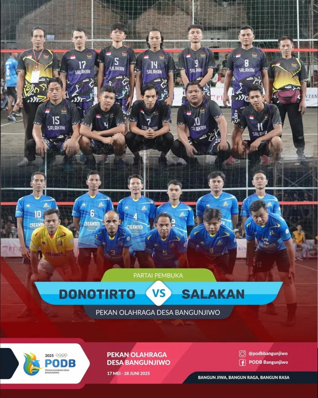Seusai pelaksanaan Upacara Open Ceremony PODB 2025 dilanjutkan dengan pertandingan perdana untuk cabor Bola Voli yang mempertemukan kontingen Padukuhan Donotirto dan Salakan. Pertandingan berjalan dengan seru dan dimenangkan oleh Padukuhan Donotirto dengan skor set 3-0.