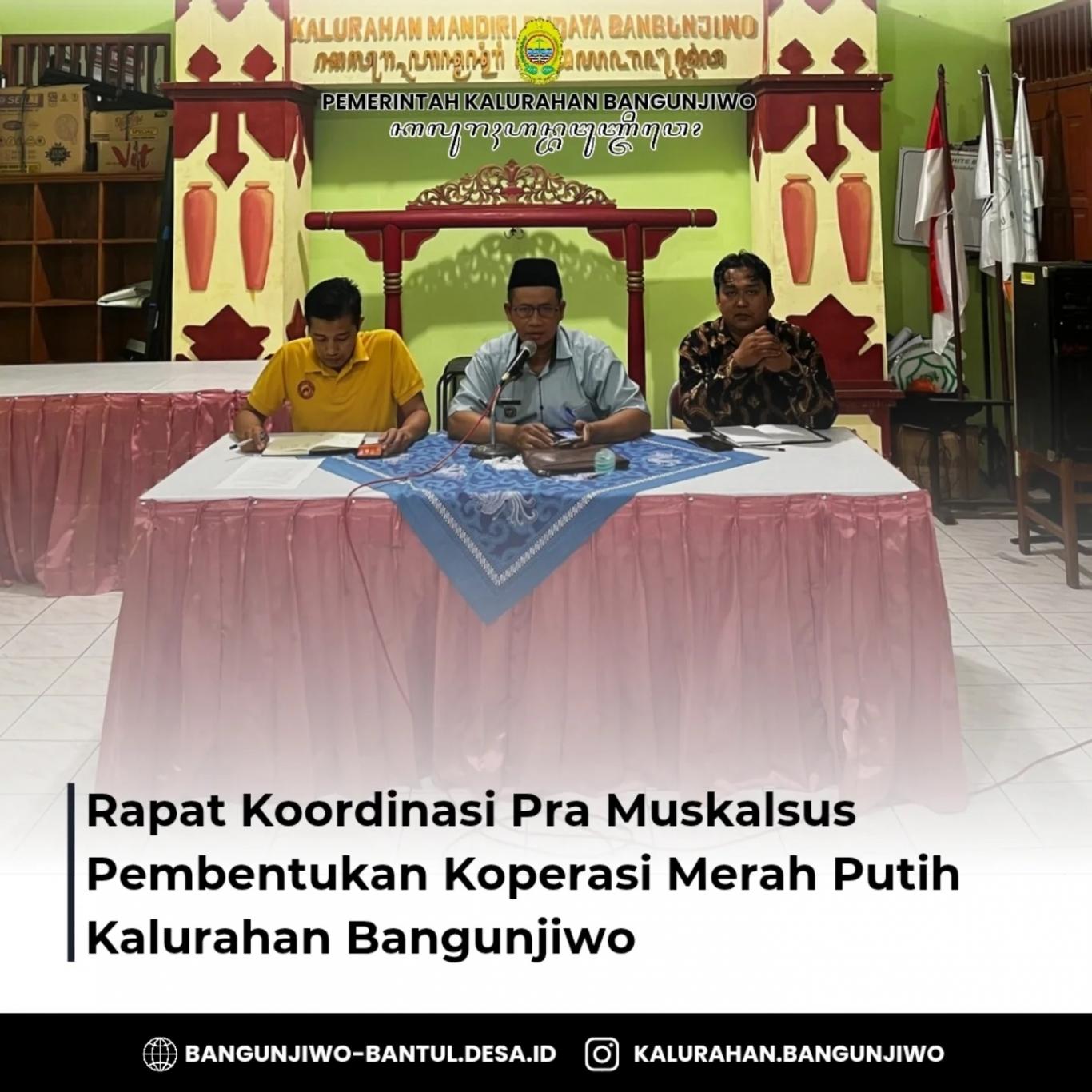 Pemerintah Kalurahan Bangunjiwo melaksanakan kegiatan rapat koordinasi pra muskalsus pembentukan Koperasi Merah Putih Kalurahan Bangunjiwo tahun 2025 pada hari Jumat (23/05/2025). Kegiatan ini dihadiri oleh Lurah beserta jajaran Carik, Kasi, Kaur, dan Bamuskal Bangunjiwo beserta jajaran. Adapun poin yang dibahas dalam kegiatan ini antara persiapan dilaksanakannya muskal tentang Koperasi Desa Merah Putih Kalurahan Bangunjiwo yang akan dilaksanakan hari selasa besok. Selanjutnya dalam rapat ini juga membahas mengenai perencanaan lokasi Koperasi Desa Merah Putih Kalurahan Bangunjiwo.
