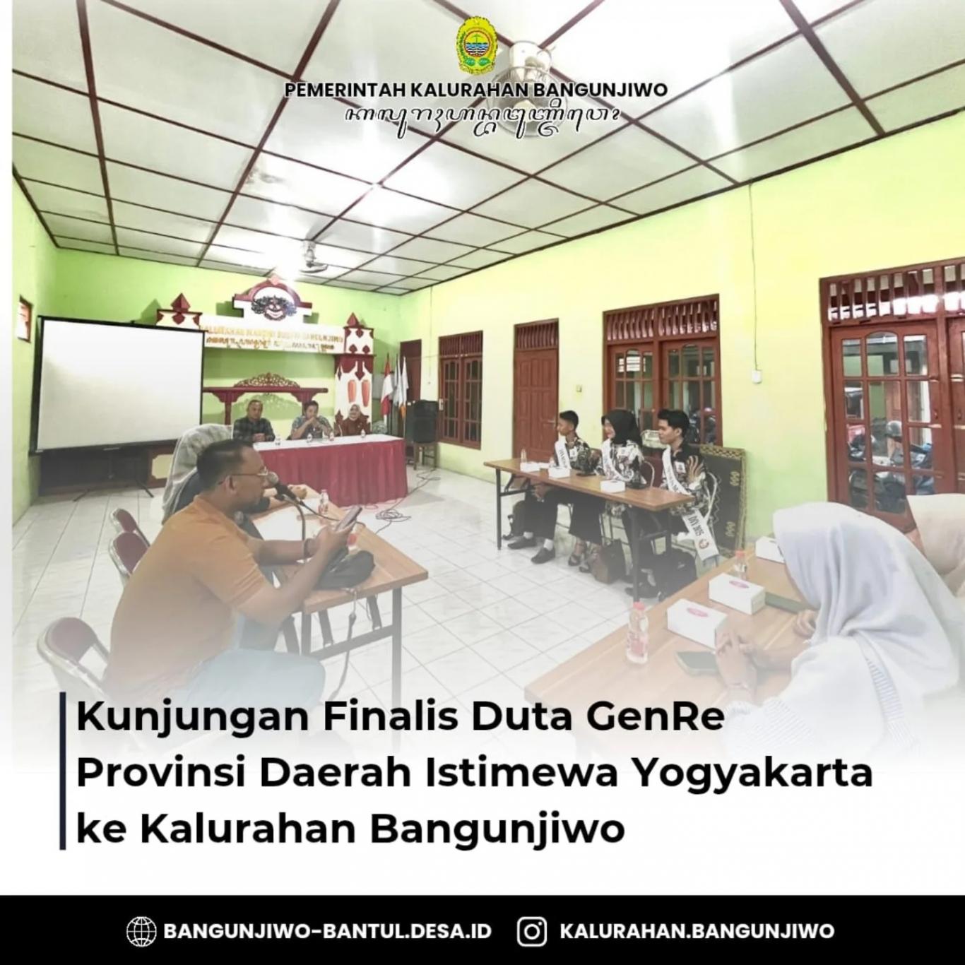 Jumat 30 Mei 2025, Pemerintah Kalurahan Bangunjiwo memfasilitasi kunjungan Finalis Duta GenRe Daerah Istimewa Yogyakarta. Duta Generasi Berencana (Duta GenRe) adalah perwujudan remaja yang memiliki pengetahuan, sikap, dan perilaku sebagai remaja yang berencana dalam kehidupan berkeluarga. Duta GenRe berperan sebagai figur teladan dan motivator di kalangan remaja untuk menjaga kesehatan reproduksi, menjauhi perilaku negatif seperti narkoba, seks bebas, dan pernikahan dini, serta menginspirasi remaja lain untuk hidup sehat dan cerdas.