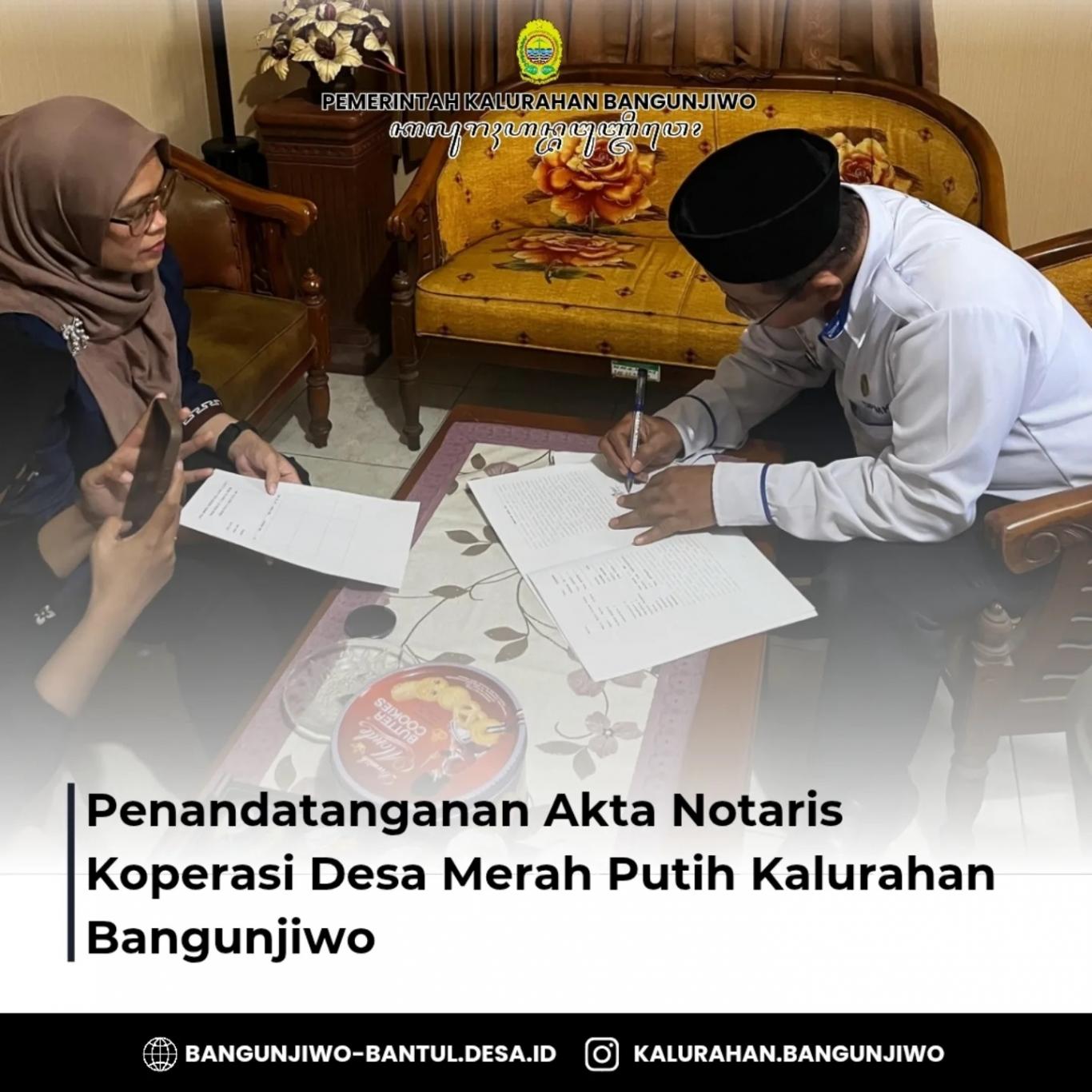 Pemerintah Kalurahan Bangunjiwo melaksanakan penandatanganan akta notaris untuk Koperasi Desa Merah Putih Kalurahan Bangunjiwo. Kegiatan ini dilaksanakan di ruang Lurah Bangunjiwo.