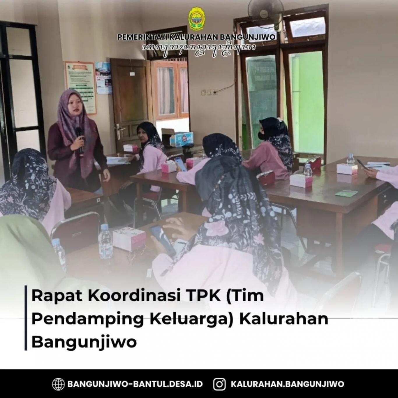 Sabtu 21/06 Bertempat di ruang rapat Kalurahan Bangunjiwo telah diselenggarakan Rapat Koordonasi TPK Kalurahan Bangunjiwo. Rapat koordinasi Tim Pendamping Keluarga (TPK) di Kalurahan Bangunjiwo, Bantul, adalah pertemuan rutin yang bertujuan untuk membahas dan menyusun rencana aksi serta melaporkan progres pendampingan keluarga. Rapat ini melibatkan berbagai unsur seperti bidan, PKK, kader KB, dan petugas lainnya, yang bekerja di bawah koordinasi Penyuluh Keluarga Berencana (PKB). Sasaran utama pendampingan adalah calon pengantin, ibu hamil, serta bayi dan balita, dengan fokus pada pencegahan stunting dan peningkatan kesehatan keluarga.