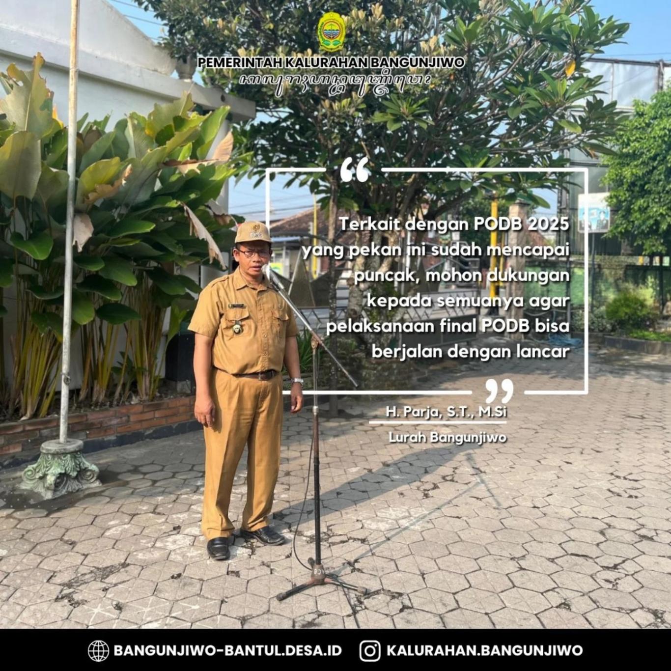 Pemerintah Kalurahan Bangunjiwo melaksanakan kegiatan apel pagi pada Senin (23/06/2025). Apel pagi ini diikuti oleh Lurah beserta jajaran pamong dan Bamuskal Kalurahan Bangunjiwo. Dalam apel pagi hari ini, Lurah Bangunjiwo, Bapak H. Parja, S.T., M.Si. menyampaikan bahwa terkait dengan pelaksanaan Pekan Olahraga Desa Bangunjiwo Tahun 2025 telah mencapai di penghujung acara dimana pekan ini akan dilaksanakan final untuk cabang olahraga sepakbola dan bola voli. Pembina apel menyampaikan untuk dukungan semua pihak agar pelaksanaan final PODB dapat berjalan dengan lancar. Selanjutnya, pembina apel mengingatkan bahwa waktu efektif pelaksanaan anggaran hanya bersisa 5 bulan, untuk itu dimohon pelaksana kegiatan untuk mencermati kembali terkait dengan kegiatan yang belum terlaksana.