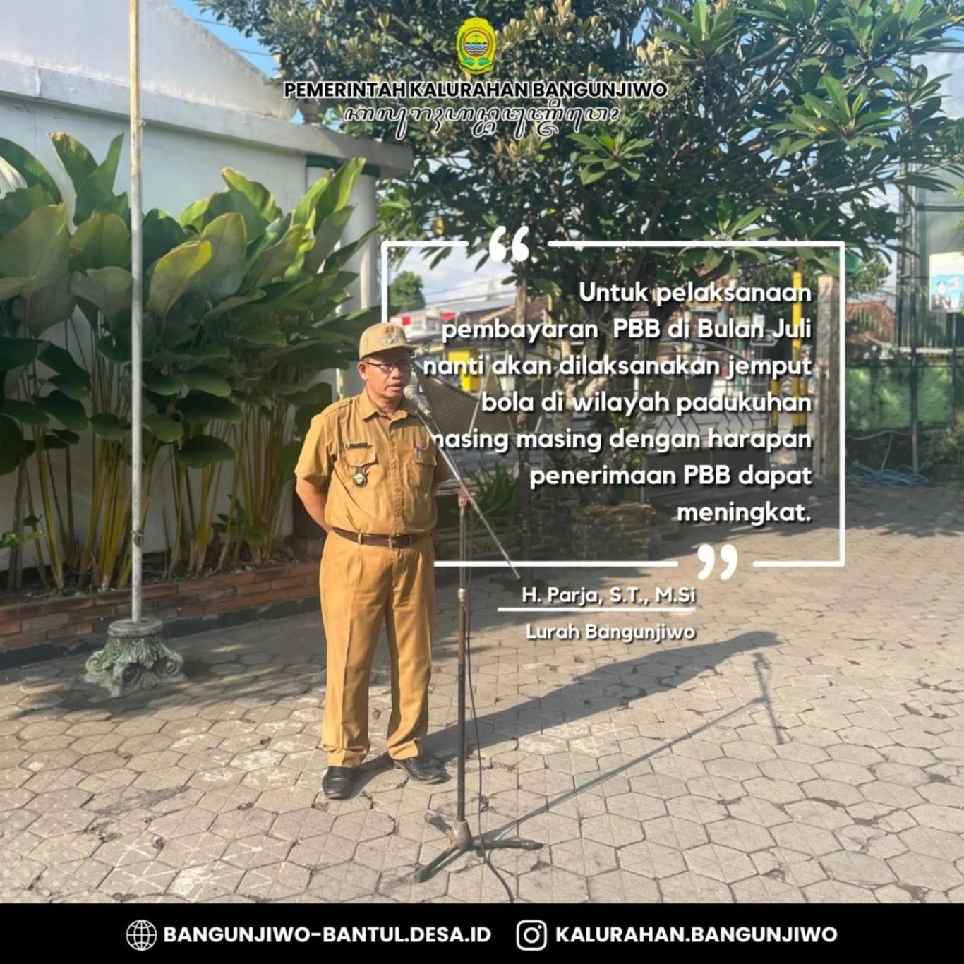 Pemerintah Kalurahan Bangunjiwo melaksanakan kegiatan apel pagi pada Senin (07/07/2025). Apel pagi ini diikuti oleh Lurah beserta jajaran pamong dan Bamuskal Kalurahan Bangunjiwo. Dalam apel pagi hari ini, Lurah Bangunjiwo, Bapak H. Parja, S.T., M.Si. menyampaikan terkait dengan pembayaran PBB tahap kedua di Bulan Juli nantinya akan dilaksanakan posko jemput bola di masing-masing padukuhan. Dengan adanya posko PBB nantinya diharapkan mampu meningkatkan penerimaan PBB di Kalurahan Bangunjiwo. Selanjutnya, pembina apel menyampaikan bahwa sebentar lagi akan dilaksanakan seleksi dukuh baru untuk Padukuhan Donotirto yang sudah purna tugas. Seleksi ini nantinya akan dilaksanakan di Bulan September.
