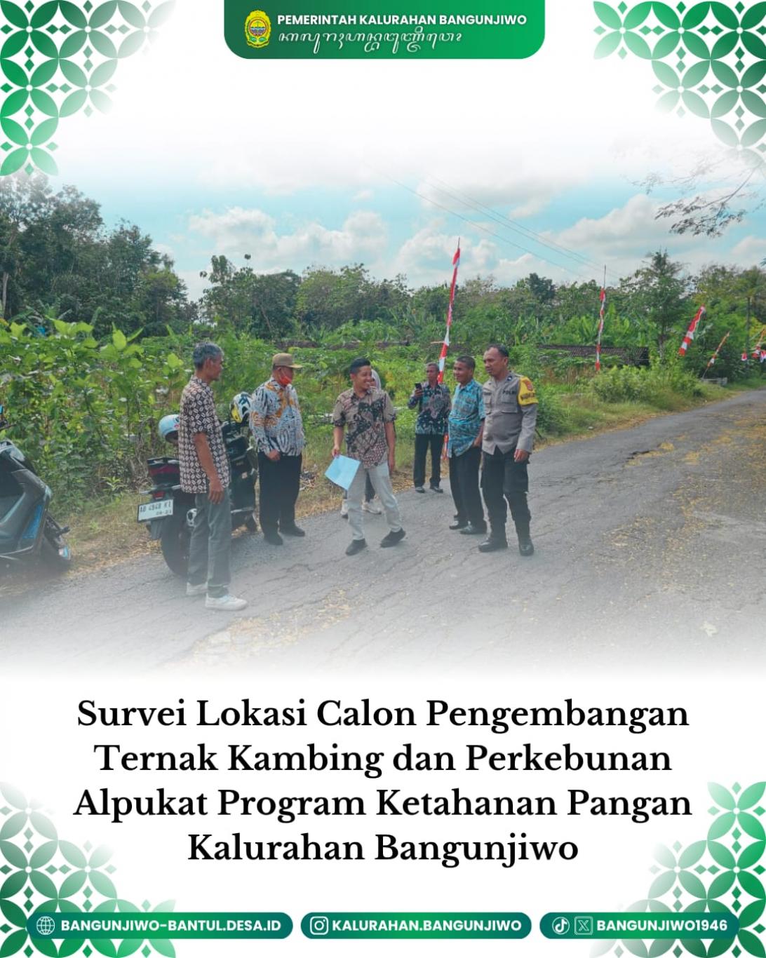 Kamis 31/07 Pemerintah Kalurahan Bangunjiwo melaksanakan survei lokasi calon pengembangan program Ketahanan Pangan Tahun 2025. Lokasi berada di tanah kas Kalurahan Bangunjiwo yang berlokasi di Padukuhan Kalangan, dimana kawasan tersebut sudah dijadikan tempat kandang kelompok.