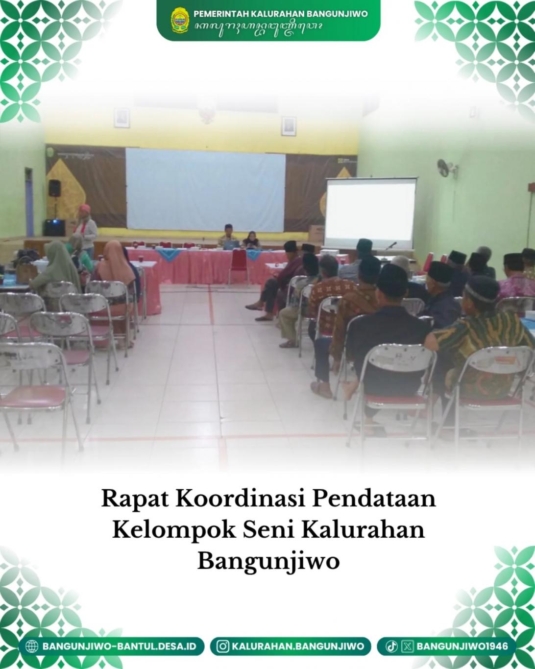 Kamis malam 31/07 Pemerintah Kalurahan Bangunjiwo menyelenggarakan rapat koordinasi bersama kelompok seni seKalurahan Bangunjiwo. Rapat dilaksanakan di Gedung Sastro Soekarno Kalurahan Bangunjiwo dihadiri oleh Ketua Desa Budaya Bangunjiwo, Pendamping Desa Budaya Bangunjiwo serta Ketua Kelompok Seni di Kalurahan Bangunjwo.