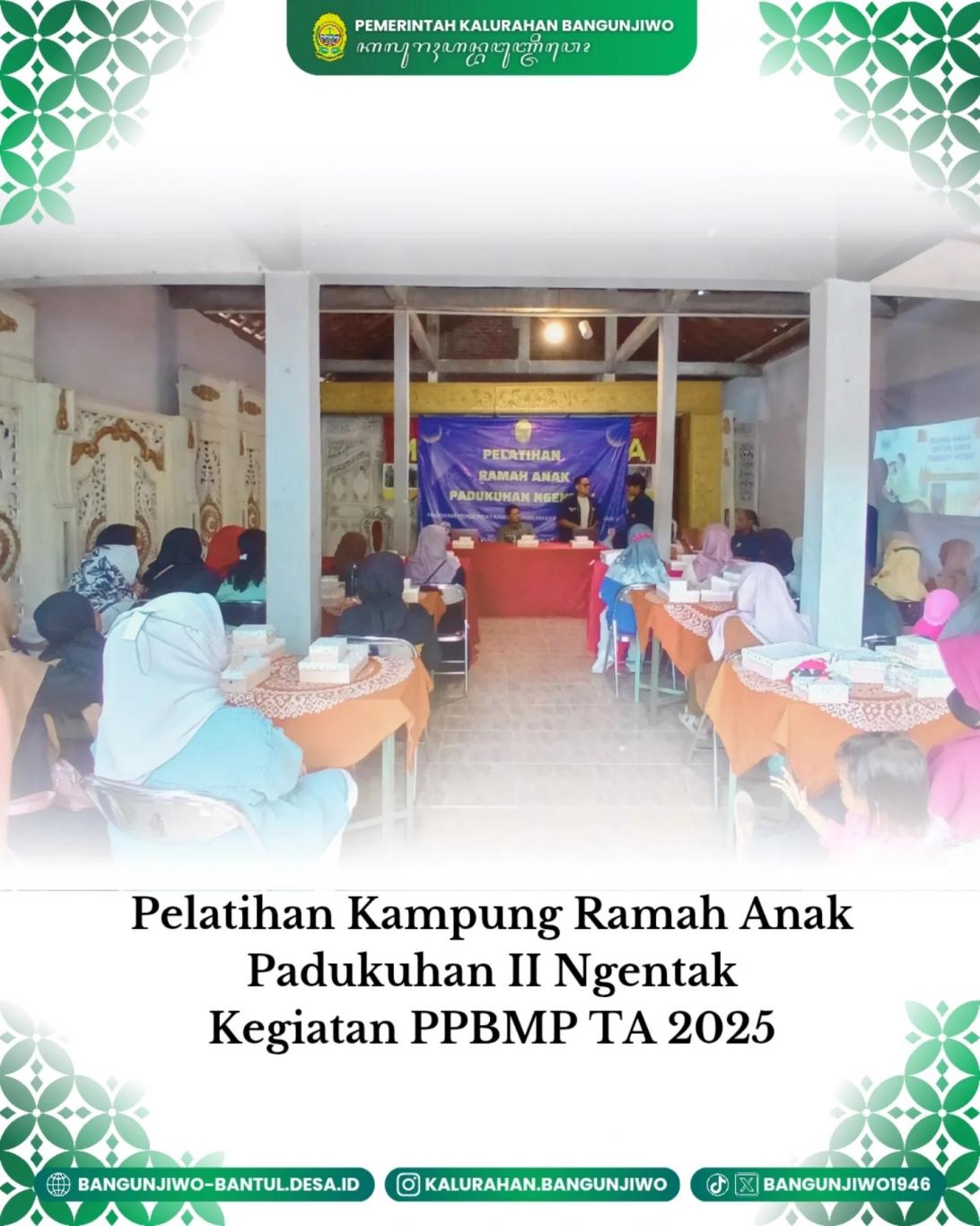 Jumat 1/8 Padukuhan Ii Ngentak Kalurahan Bangunjiwo melaksanakan Pelatihan Kampung Ramah Anak Program PPBMP TA 2025. Kegiatan ini dilaksanakan dlaam rangka untuk menciptakan lingkungan yang aman, nyaman, dan mendukung tumbuh kembang anak, serta memenuhi hak-hak mereka serta mendukung program Kabupaten Bantul Layak Anak. Pelatihan ini melibatkan masyarakat, aparatur kampung, kader, dan menghadirkan narasumber Dosen UPY Muhammad Abdullah Juhdi, S. PSI., M. P. Si. Psikolog.