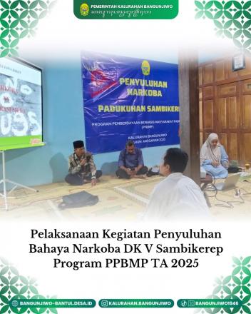 Minggu 10/08 Padukuhan VI Sambikerep Bangunjiwo melaksanakan kegiatan penyuluhan bahaya penyalahgunaan narkoba. Kegiatan ini merupakan pelaksanaan program PPBMP TA 2025. Kegiatan penyuluhan bahaya narkoba sangat penting untuk meningkatkan kesadaran dan pengetahuan masyarakat, terutama kalangan remaja dan anak-anak, tentang bahaya narkoba.
