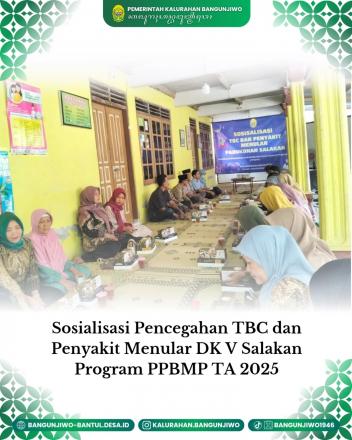 Selasa 12/08 Pemerintah Kalurahan Bangunjiwo melaksanakan kegiatan Sosialisasi Pencegahan TBC dan Penyakit Menular di Padukuhan Salakan. Kegiatan ini didanai melalui program PPBMP TA 2025. Sosialisasi pencegahan TBC dan penyakit menular ini dilaksnaakan dalam rangka untuk meningkatkan kesadaran dan pengetahuan masyarakat tentang penyakit TBC dan penyakit menular lainnya, serta cara mencegah penyebarannya. Kegiatan ini melibatkan penyuluhan, edukasi, dan pemberian informasi mengenai gejala, penyebab, cara penularan, dan pencegahan penyakit.