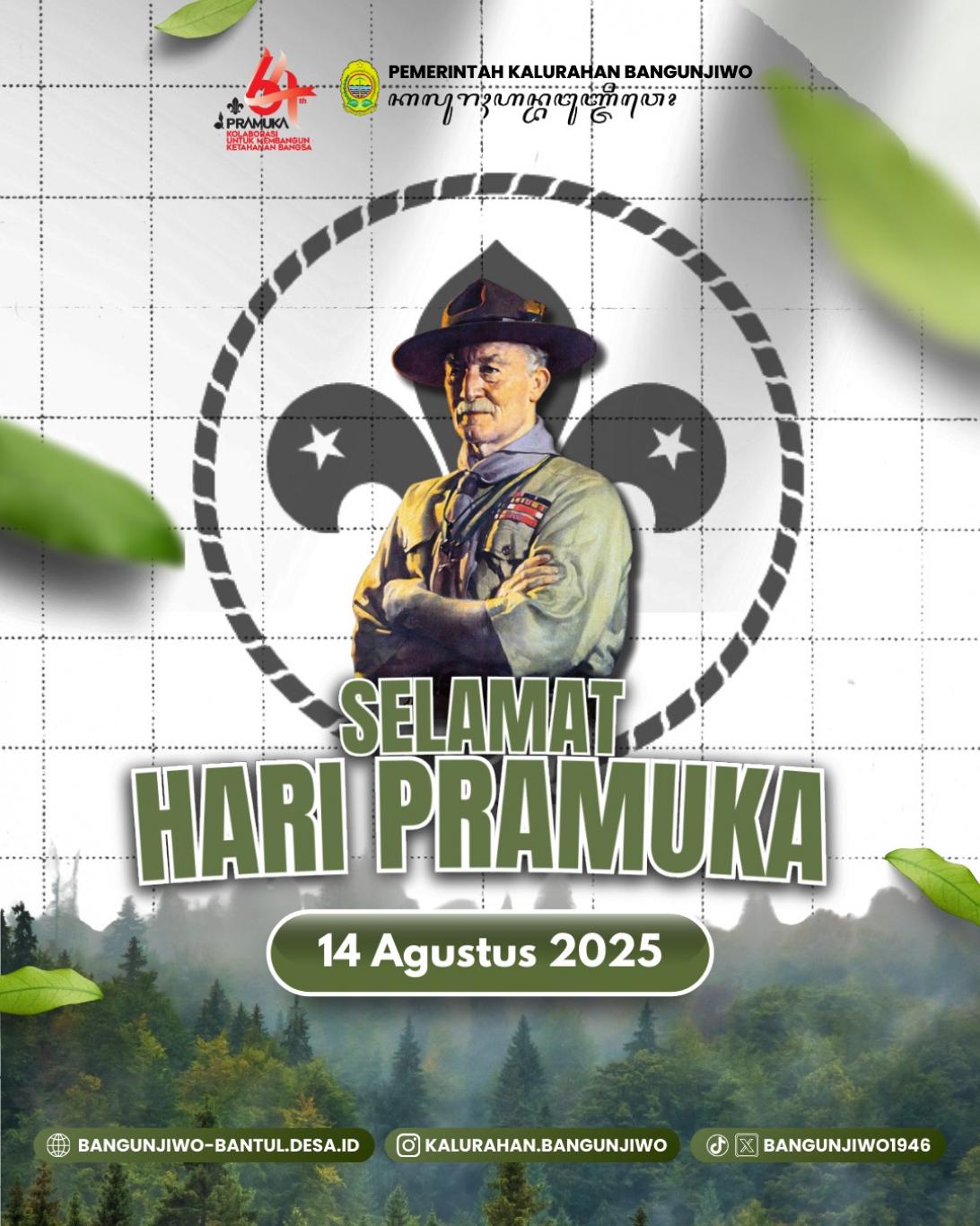 Pemerintah Kalurahan Bangunjiwo mengucapkan Selamat Hari Pramuka. Mari kita kobarkan semangat Satya dan Darma untuk membentuk generasi yang disiplin, tangguh, dan siap mengabdi bagi bangsa.
