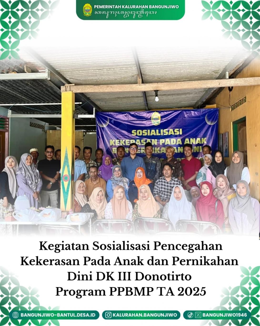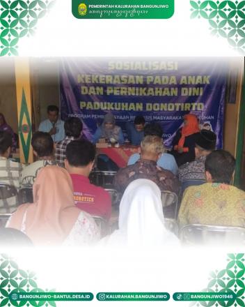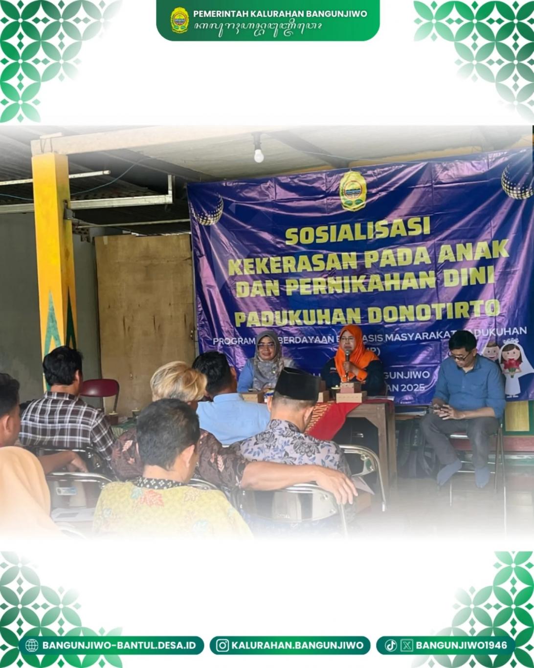 Senin 25/08 Pemerintah Kalurahan Bangunjiwo melaksanakan kegiatan Sosialisasi Pencegahan Kekerasan Terhadap Anak dan Pernikahan Usia Dini di Padukuhan Donotirto. Kegiatan ini merupakan program PPBMP TA 2025. Sosialisasi pencegahan kekerasan pada anak dan pernikahan usia dini bertujuan meningkatkan kesadaran dan pemahaman semua pihak, termasuk keluarga, sekolah, dan masyarakat, tentang dampak negatif dan cara mencegah kedua isu tersebut. Kegiatannya mencakup edukasi tentang hak anak, bahaya kekerasan dan pernikahan dini dari aspek kesehatan, psikologis, dan hukum, serta peran aktif teman sebaya dan masyarakat dalam melaporkan serta memberikan dukungan bagi korban.