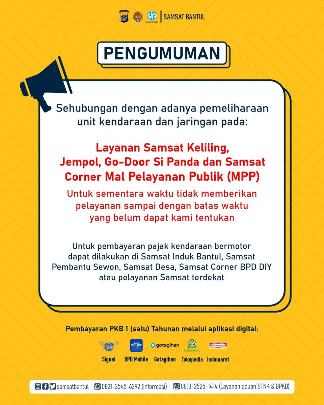 Kami sampaikan pemberitahuan Layanan Samsat Keliling, Jempol, Go-Door Si Panda dan Samsat Corner Mal Pelayanan Publik libur untuk sementara waktu sampai batas waktu yang belum ditentukan karena sedang ada pemeliharaan unit kendaraan dan jaringan.