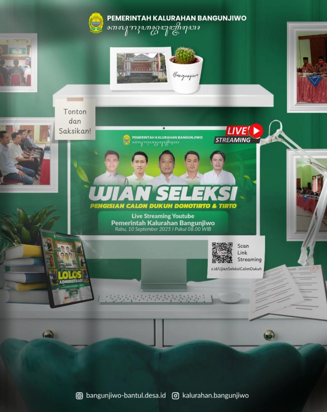 Pemerintah Kalurahan Bangunjiwo akan melaksanakan Ujian Seleksi Pamong Kalurahan Formasi Jabatan Dukuh Donotirto dan Tirto Tahun 2025.