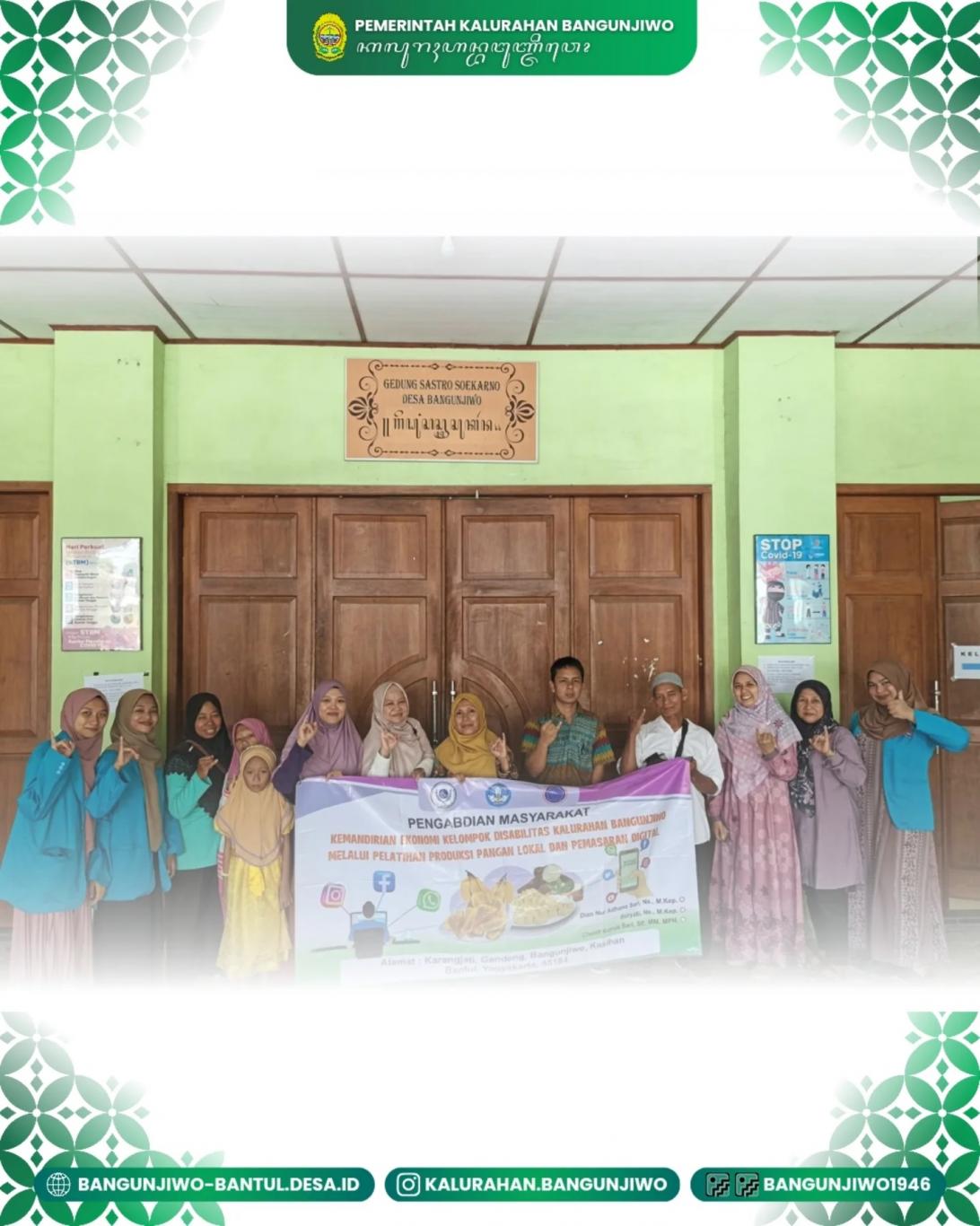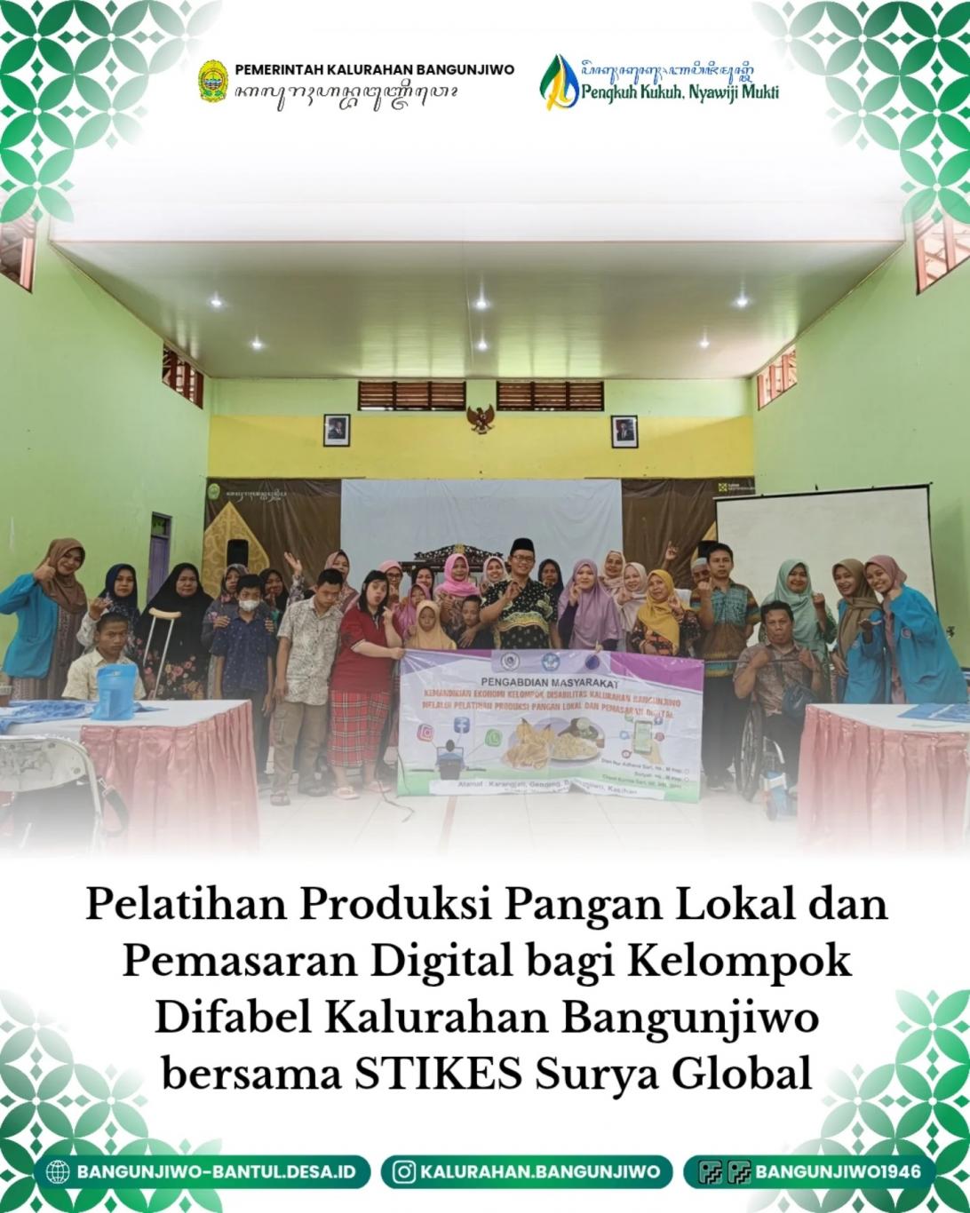 Sabtu 18/10 Pemerintah Kalurahan Bangunjiwo berkolaborasi dengan STIKES Surya Global Yogyakarta menyelenggarakan kegiatan Pelatihan Produksi Pangan Lokal dan Pemasaran Digital bagi Kelompok Difabel Kalurahan Bangunjiwo.