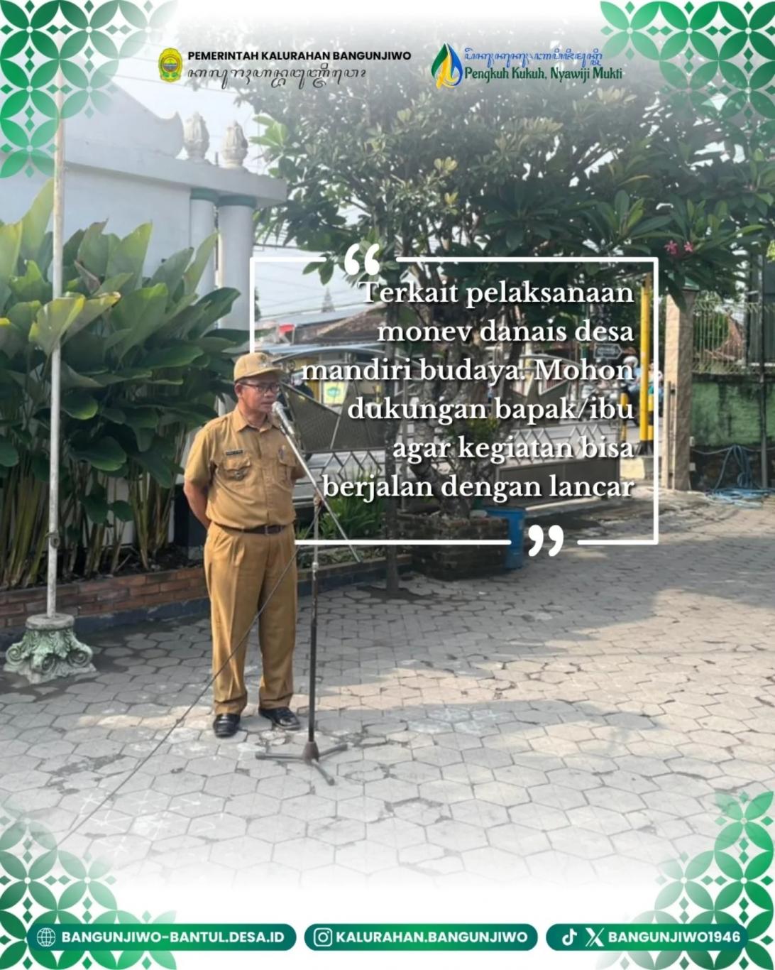 Pemerintah Kalurahan Bangunjiwo melaksanakan kegiatan apel pagi pada Senin (20/10/2025). Apel pagi ini diikuti oleh Lurah beserta jajaran pamong dan Bamuskal Kalurahan Bangunjiwo. Dalam apel pagi hari ini, Lurah Bangunjiwo, Bapak H. Parja, S.T., M.Si. menyampaikan terkait dengan rangkaian perubahan anggaran pendapatan dan belanja Kalurahan Bangunjiwo tahun 2025 telah dilaksanakan tinggal menunggu evaluasi dari Pemerintah Kapanewon Kasihan, harapannya setelah diapprove nantinya bisa segera dilaksanakan khususnya terkait dengan program ketahanan pangan. Selanjutnya, pembina apel menyampaikan terkait dengan pelaksanaan monitoring dan evaluasi dana keistimewaan Desa Mandiri Budaya Kalurahan Bangunjiwo yang akan dilaksanakan besok pagi. Terkait hal tersebut pembina apel memohon dukungan seluruh pihak agar kegiatan esok hari berjalan dengan lancar.