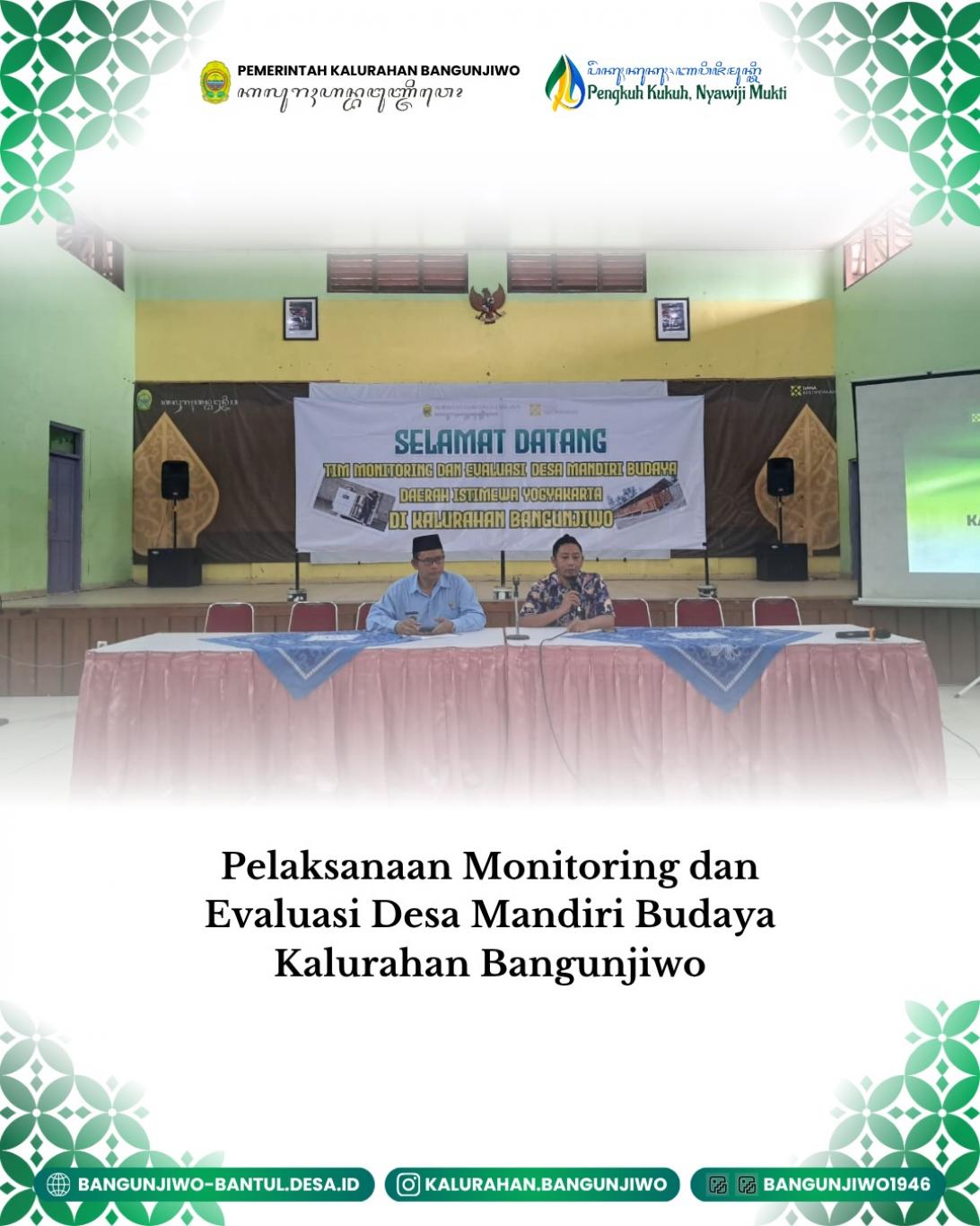 Pelaksanaan Monitoring dan Evaluasi (Monev) Desa Mandiri Budaya di Kalurahan Bangunjiwo dilaksanakan oleh Tim Monitoring dan Evaluasi Desa Mandiri Budaya Daerah Istimewa Yogyakarta. Kegiatan ini bertujuan untuk melihat keberlanjutan (sustainability) penerapan empat pilar Desa Mandiri Budaya, yaitu Desa Budaya, Desa Wisata, Desa Preneur, dan Desa Prima, sebagai upaya mewujudkan masyarakat yang berdaya, kreatif, dan berbudaya.