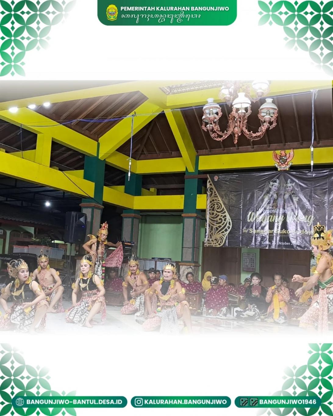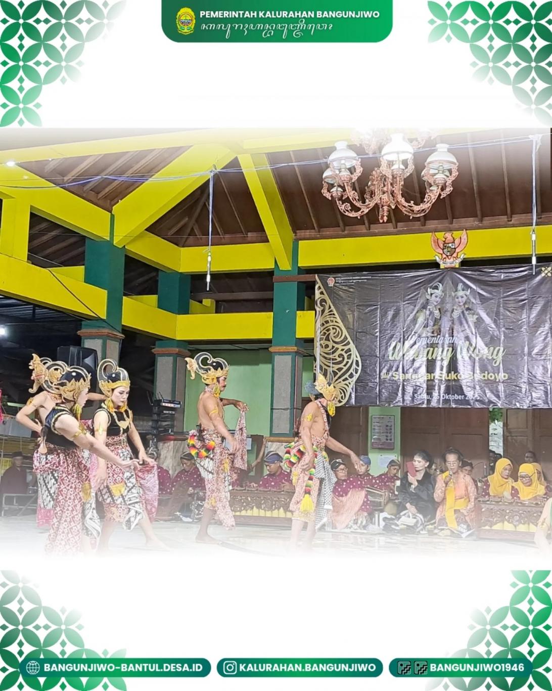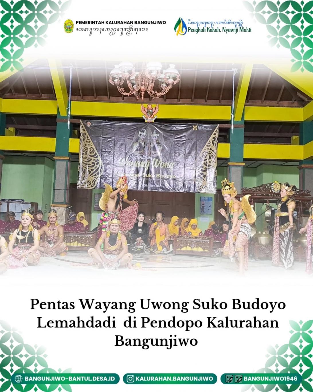 Sabtu 25/10 Sanggar Seni Wayang Uwong Suko Budoyo Padukuhan Lemahdadi melaksanakan pentas di Pendopo Kalurahan Bangunjiwo. Kegiatan ini merupakan program fasilitasi pentas seni budaya Dana Keistimewaan dari Dinas Kebudayaan (Kundha Kabudayan) DIY melalui aspirasi Ibu Arni Tyas Palupi, S.T. anggota DPRD DIY.