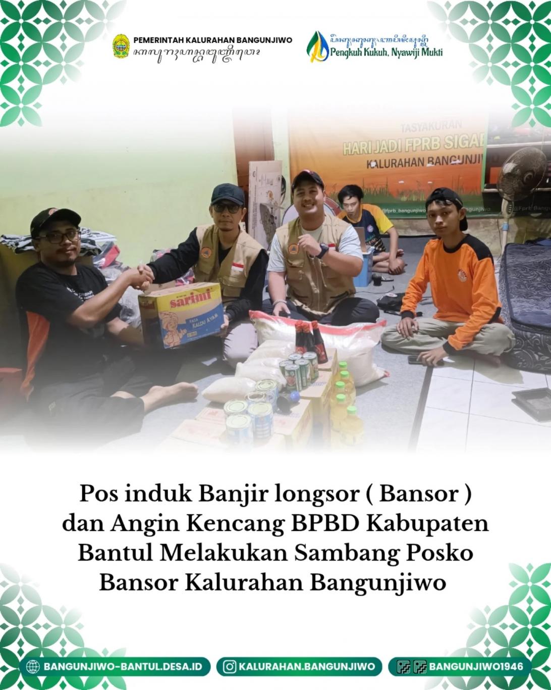 Pos induk Banjir longsor ( Bansor ) dan angin kencang BPBD kabupaten Bantul melakukan sambang posko Bansor Kalurahan Bangunjiwo, selain sebagai sarana silaturahim Kegiatan ini juga bertujuan untuk melihat kesiapan posko Bansor dan juga relawan kemanusiaan kalurahan Bangunjiwo jika suatu waktu ada hal hal yang tidak diinginkan, pada kesempatan ini BPBD kabupaten Bantul juga memberikan bantuan logistik permakanan sebagai sarana penunjang piket relawan selama aktivasi posko Bansor. Logistik diterima langsung oleh Agil Dwi Raharjo selaku kordinator posko Bansor Kalurahan Bangunjiwo dan juga relawan kemanusiaan dan penanggulangan Bencana kalurahan Bangunjiwo