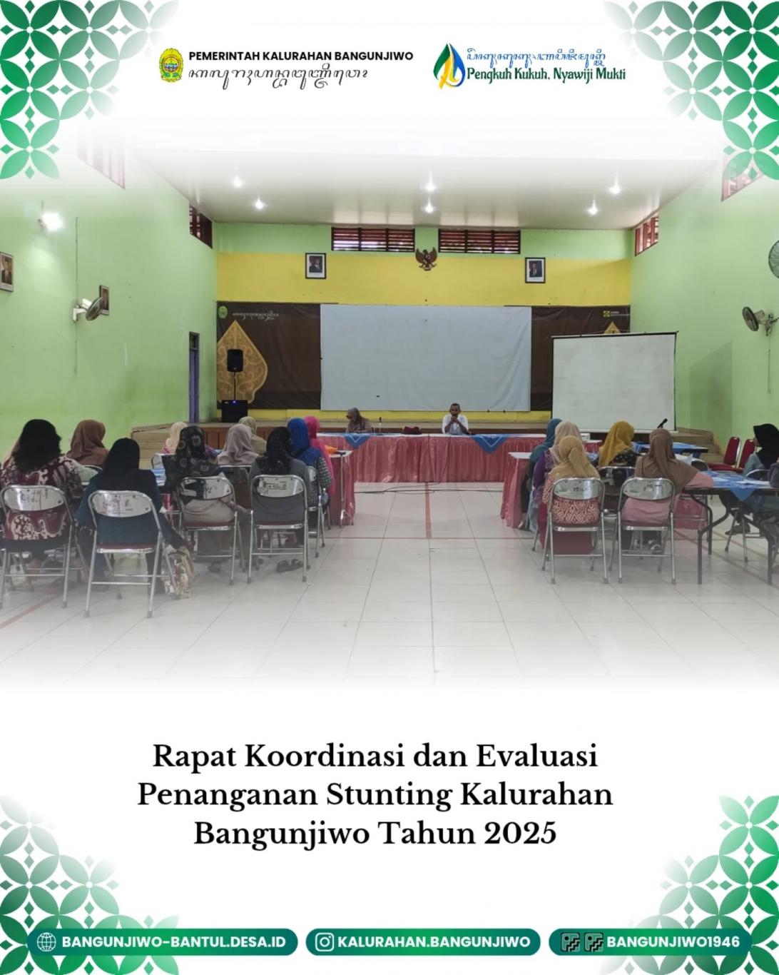 Koordinasi ini sekaligus sebagai evaluasi atas pelaksanaan program penanganan stunting Kalurahan Bangunjiwo. Salah satunya adalah pemberian PMT bagi balita gizi kurang selama 56 hari berturut-turut yang didanai dengan Dana Keistimewaan BKK Reformasi Kalurahan TA 2025.