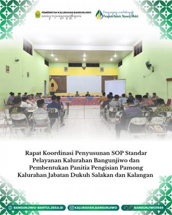 Pada Jumat malam, 28 November 2025, telah dilaksanakan Rapat Koordinasi Penyusunan SOP Standar Pelayanan Kalurahan Bangunjiwo serta Pembentukan Panitia Pengisian Pamong Kalurahan untuk Jabatan Dukuh Salakan dan Dukuh Kalangan.