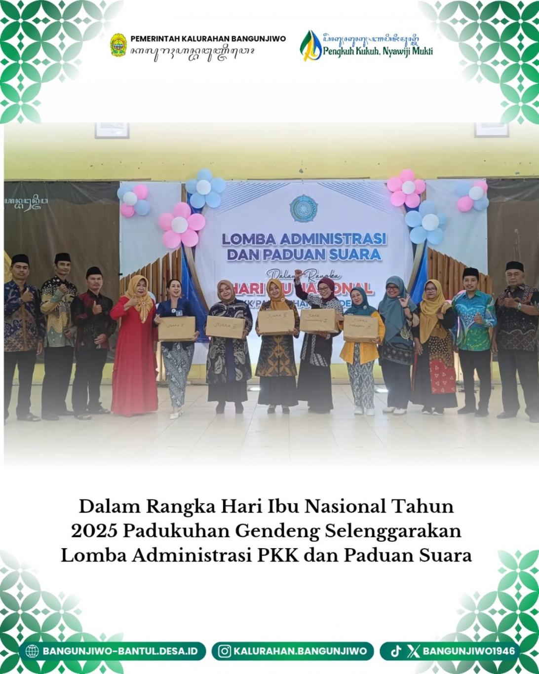 Dalam peringatan Hari Ibu Nasional Tahun 2025 ini Padukuhan Gendeng menyelenggarakan lomba administrasi PKK dan paduan suara. Penilaian administrasi PKK sudah diselenggarakan 3 hari yang lalu di sekretariat PKK Padukuhan sedangkan untuk lomba paduan suara dilaksanakan hari ini di Gedung Sastro Soekarno diikuti 16 kelompok paduan suara.