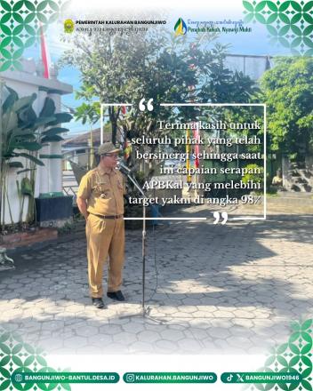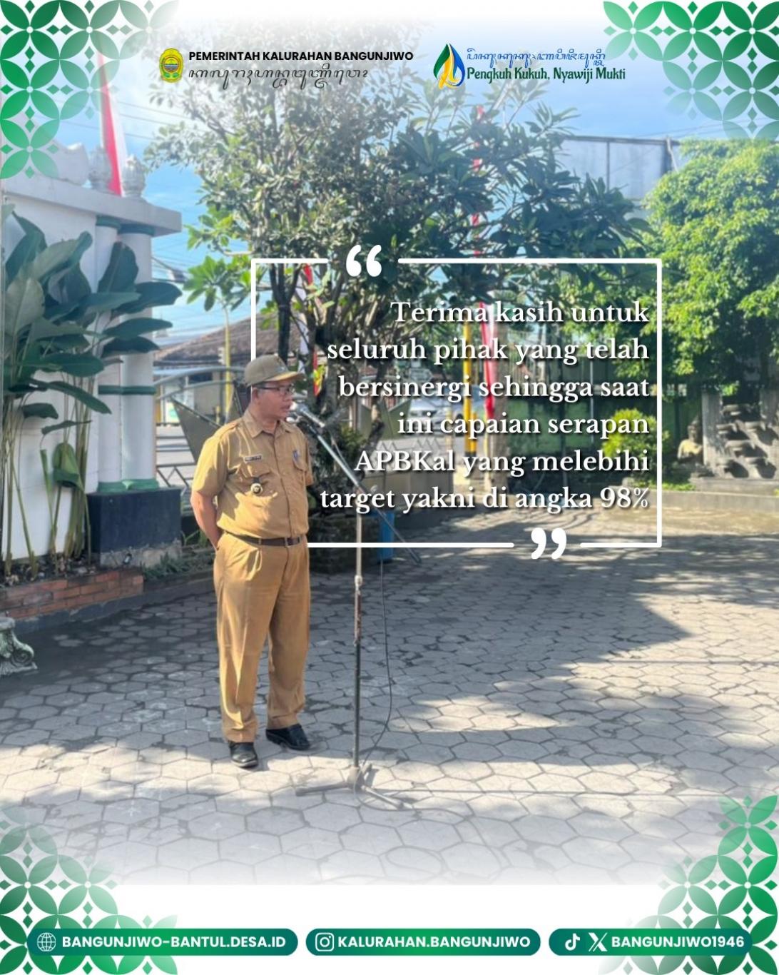 Pemerintah Kalurahan Bangunjiwo melaksanakan kegiatan apel pagi pada Senin (22/12/2025). Apel pagi ini diikuti oleh Lurah beserta jajaran pamong dan Bamuskal Kalurahan Bangunjiwo. Dalam apel pagi hari ini, Lurah Bangunjiwo, Bapak H. Parja, S.T., M.Si. menyampaikan apresiasi kepada seluruh pihak atas kerjamasanya terkait dengan capaian serapan serapan APBKal yang mencapai 98% di tahun 2025. Selanjutnya, pembina apel menyampaikan bahwa saat ini masih ada 2 agenda terdekat yang harus dilaksanakan yakni agenda penerimaan pamong baru untuk jabatan dukuh kalangan & dukuh salakan dan agenda muskal terkait dengan pelaporan hasil pembangunan di tahun 2025