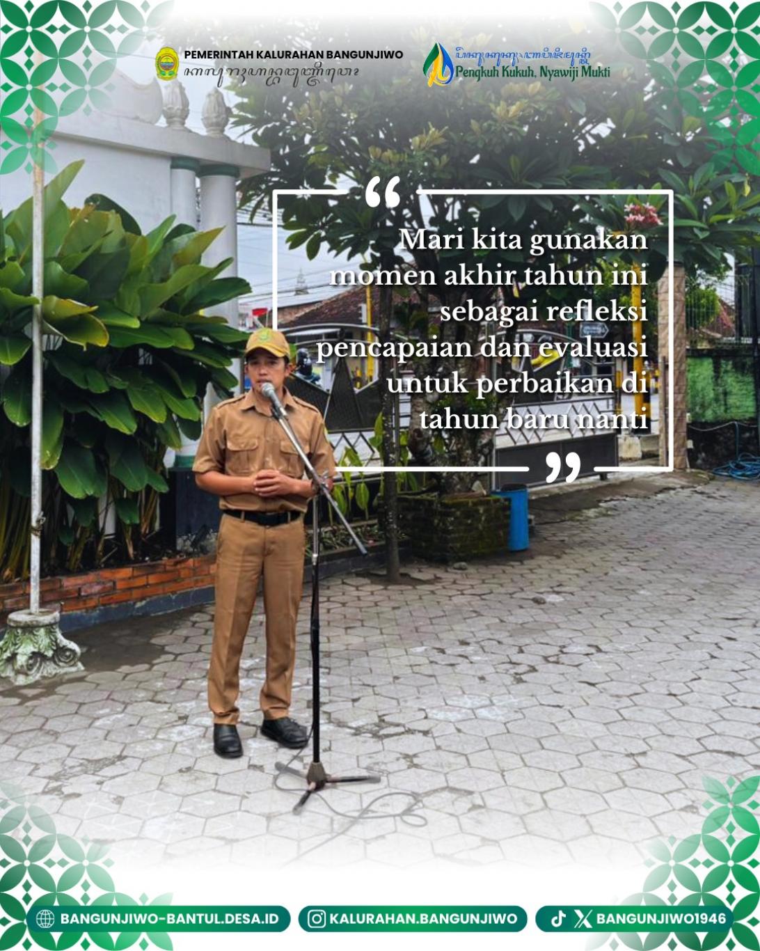 Pemerintah Kalurahan Bangunjiwo melaksanakan kegiatan apel pagi pada Senin (29/12/2025). Apel pagi ini diikuti oleh Lurah beserta jajaran pamong dan Bamuskal Kalurahan Bangunjiwo. Dalam apel pagi hari ini, Carik Bangunjiwo, Bapak Mugi Raharjo, A.Md. menyampaikan himbauan kepada seluruh pamong untuk menjaga kondusifitas selama perayaan tahun baru 2026 dimana bisa mengoptimalkan fungsi siskamling yang ada di wilayah. Selanjutnya, pembina apel meningformasikan bahwa nantinya pada hari Rabu akan ada monitoring dari Tim dari Kapanewon Kasihan terkait dengan perayaan malam tahun baru di wilayah Kalurahan Bangunjiwo. Terakhir, pembina apel menyampaikan untuk menggunakan momen akhir tahun ini sebagai refleksi pencapaian dan evaluasi untuk perbaikan di tahun baru nanti.