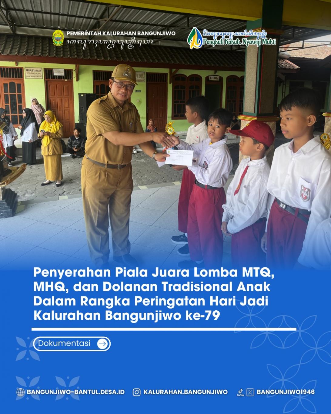 Penyerahan piala juara Lomba MTQ, MHQ, Macapat serta Lomba Dolanan Tradisional Anak dalam rangka Peringatan Hari Jadi Kalurahan Bangunjiwo ke-79 diserahkan langsung oleh Lurah Bangunjiwo, Bapak H. Parja, S.T., M.Si. Kegiatan ini merupakan bentuk apresiasi Pemerintah Kalurahan Bangunjiwo kepada anak-anak yang telah berpartisipasi dan menunjukkan prestasi terbaiknya dalam berbagai cabang lomba.