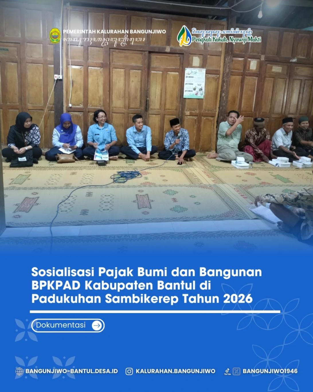 Selasa 20/1 Bertempat di kediaman Bapak Dukuh Sambikerep telah diselenggarakan kegiatan Sosialisasi Pajak Bumi dan Bangunan Tahun 2026. Kegiatan ini merupakan terobosan baru dari BPKPAD Kabupaten Bantul sebagai salah satu upaya untuk mengoptimalkan penerimaan pembayaran PBB-P2 Tahun 2026. Hadir dalam sosialisasi ini Kasubag Keuangan dan Aset BPKPAD Kabupaten Bantul, BPD DIY Kasongan, Carik Bangunjiwo, Ketua RT serta masyarakat Padukuhan Sambikerep.