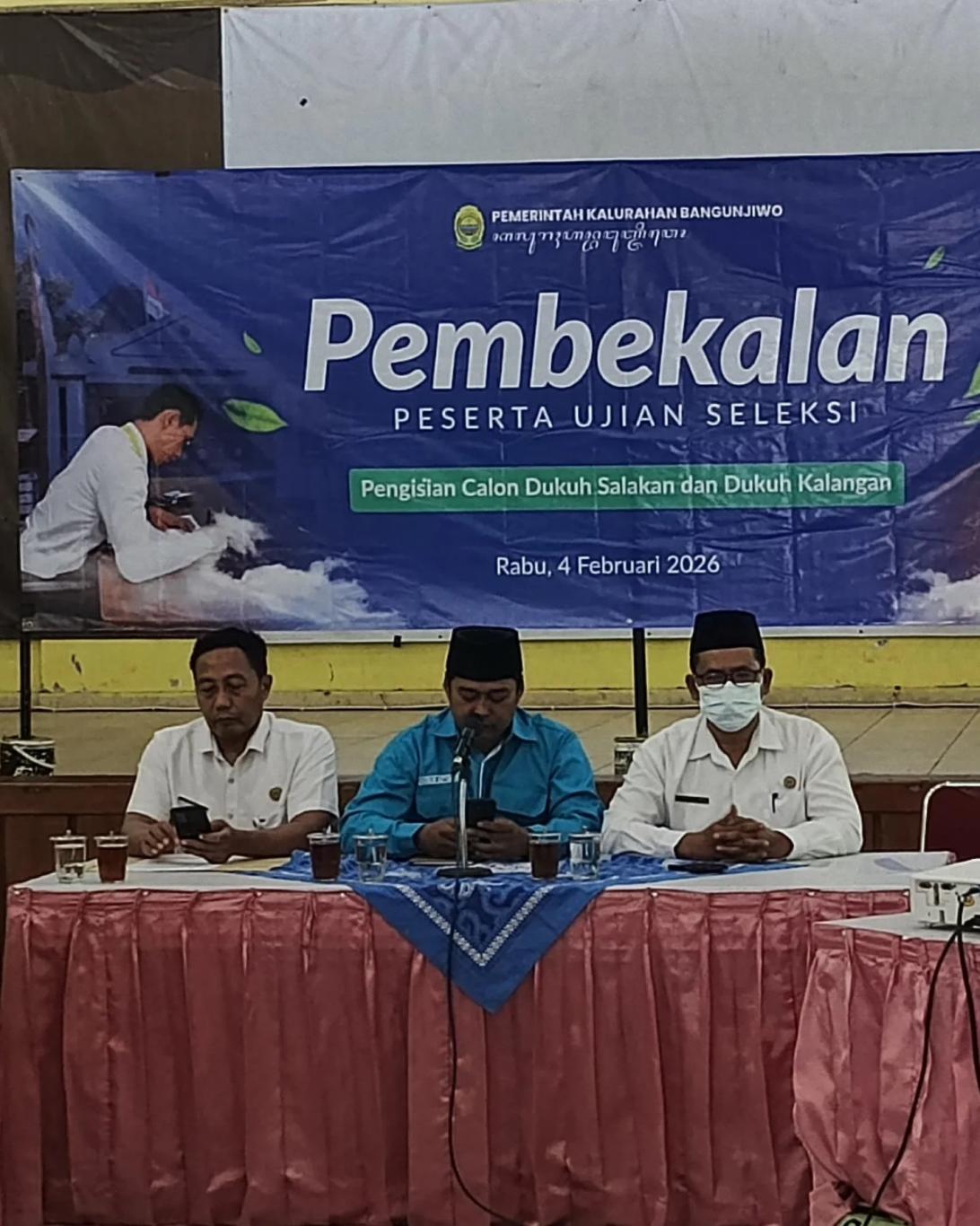 Rabu [4/2] Panitia Seleksi Lowongan Pamong Kalurahan Bangunjiwo melaksanakan Pembekalan bagi peserta ujian seleksi pamong kalurahan Tahun 2026. Pembekalan peserta ujian seleksi pamong kalurahan merupakan tahap krusial yang diselenggarakan panitia untuk memberikan pemahaman teknis, aturan, dan materi ujian kepada calon pamong yang lolos seleksi administrasi. Kegiatan ini memastikan transparansi, objektivitas, dan kesiapan fisik/mental peserta (integritas, pengetahuan, kemampuan komputer/praktik) demi mendapatkan pamong berkualitas.