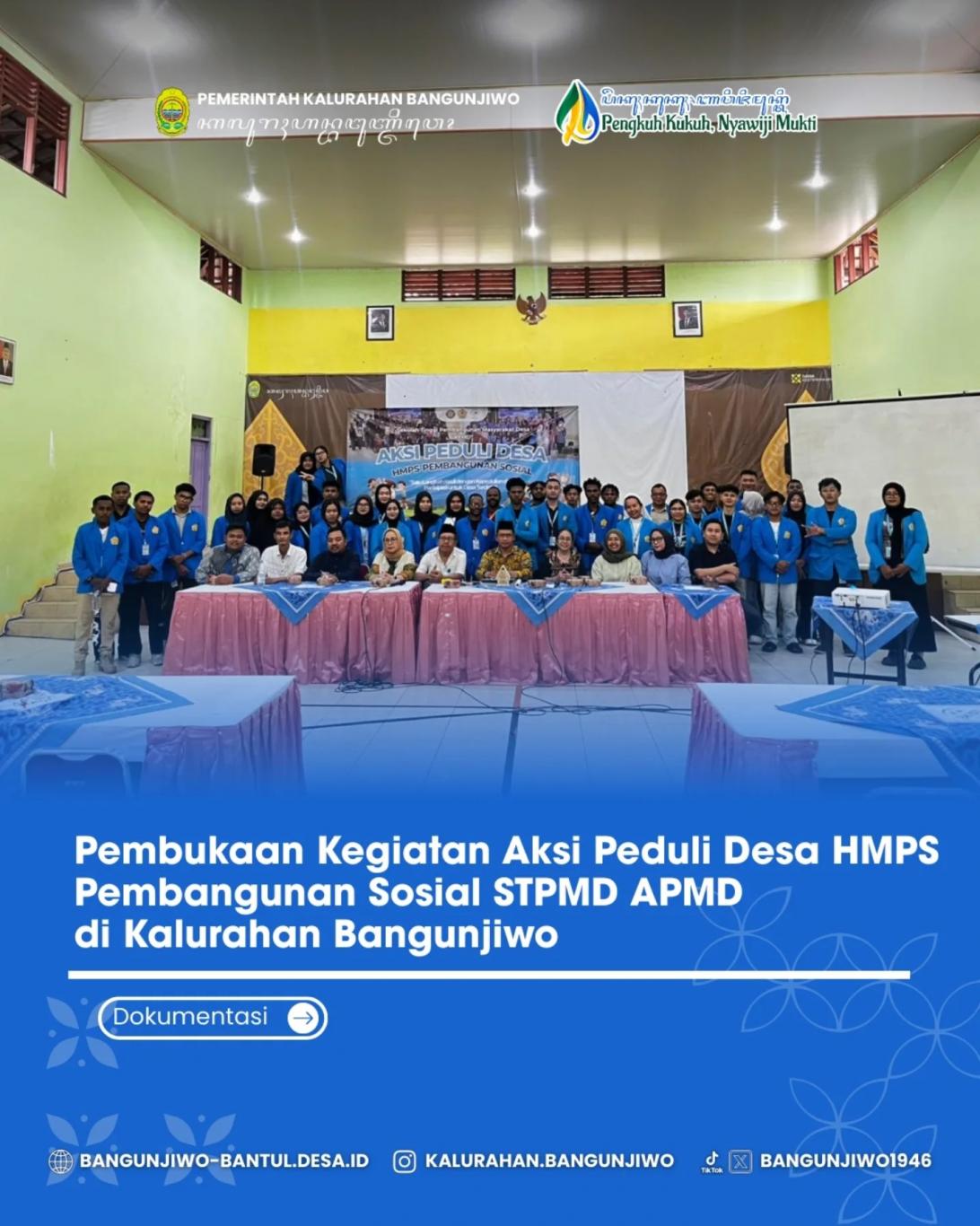 Jumat [6/2] Pemerintah Kalurahan Bangunjiwo menjadi lokasi kegiatan Aksi Peduli Desa yang dilaksanakan oleh HMPS Pembangunan Sosial Kampus STPMD APMD Yogyakarta. Kegiatan dibuka secara resmi oleh Lurah Bangunjiwo pada hari Jumat 6 Februari 2026 di Gedung Sastro Soekarno.
