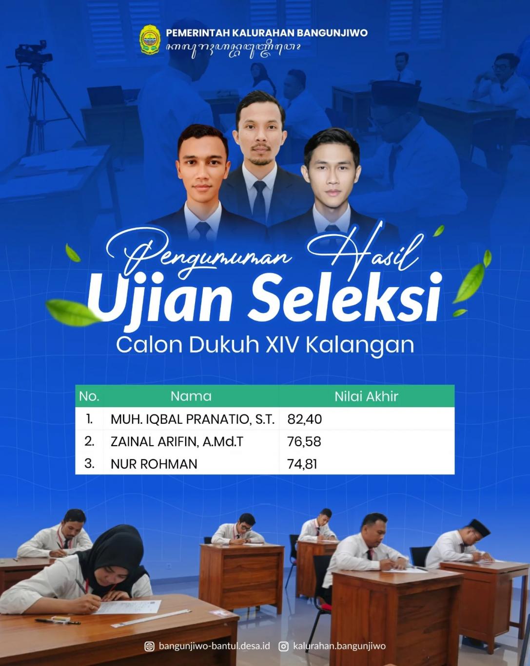 Pemerintah Kalurahan Bangunjiwo menyampaikan pengumuman resmi hasil Ujian Seleksi Calon Dukuh Tahun 2026 yang telah dilaksanakan pada hari Rabu (11/02/2026). Berdasarkan seluruh tahapan seleksi, diperoleh hasil nilai akhir sebagai berikut: