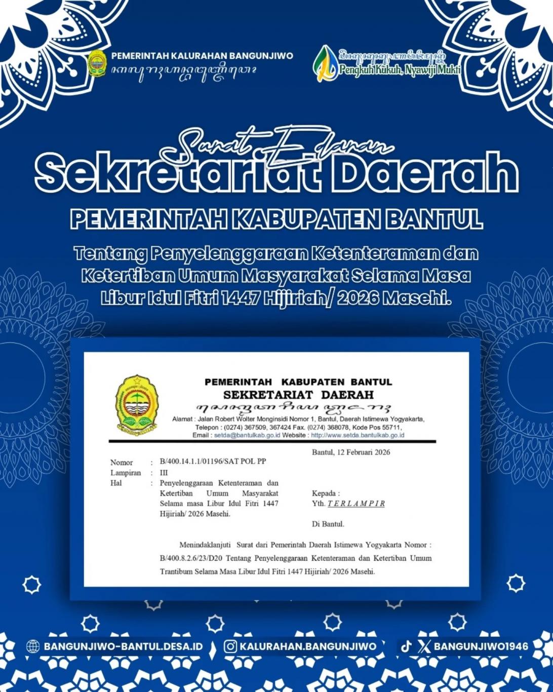 Berikut kami sampaikan Surat Edaran Sekretariat Daerah Kabupaten Bantul tentang Penyelenggaraan Trantibunlinmas Pada Masa Libur Idul Fitri 1447 H.