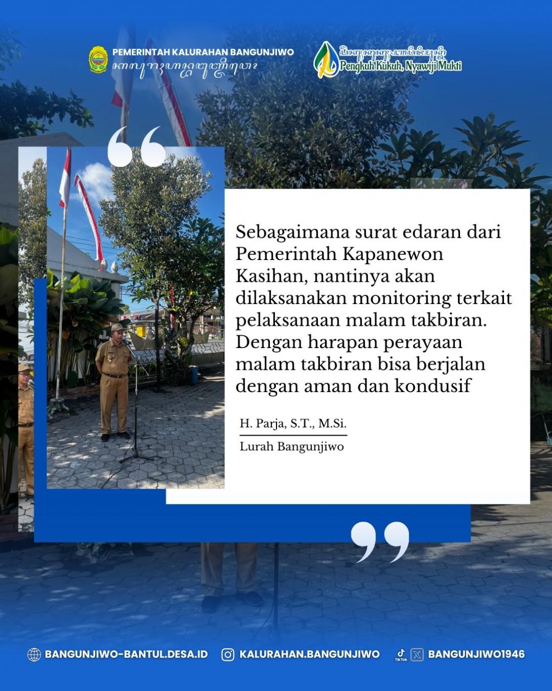 Pemerintah Kalurahan Bangunjiwo melaksanakan kegiatan apel pagi pada Senin (16/03/2026). Apel pagi ini diikuti oleh Lurah beserta jajaran pamong dan Bamuskal Kalurahan Bangunjiwo. Dalam apel pagi hari ini, Lurah Bangunjiwo, Bapak H. Parja, S.T., M.Si. menyampaikan sebagaimana surat edaran dari Pemerintah Kapanewon Kasihan, nantinya akan dilaksanakan monitoring terkait pelaksanaan malam takbiran. Dengan harapan perayaan malam takbiran bisa berjalan dengan aman dan kondusif. Selanjutnya pembina apel menyampaikan kepada seluruh pamong untuk menjaga kondusifitas di wilayah masing-masing terkait dengan perayaan malam takbiran idul fitri. Terakhit, pembina apel menyampaikan pelaksanaan libur dan cuti bersama dalam rangka Hari Raya Idul Fitri 1447H akan dimulai tanggal 18-24 Maret 2026.